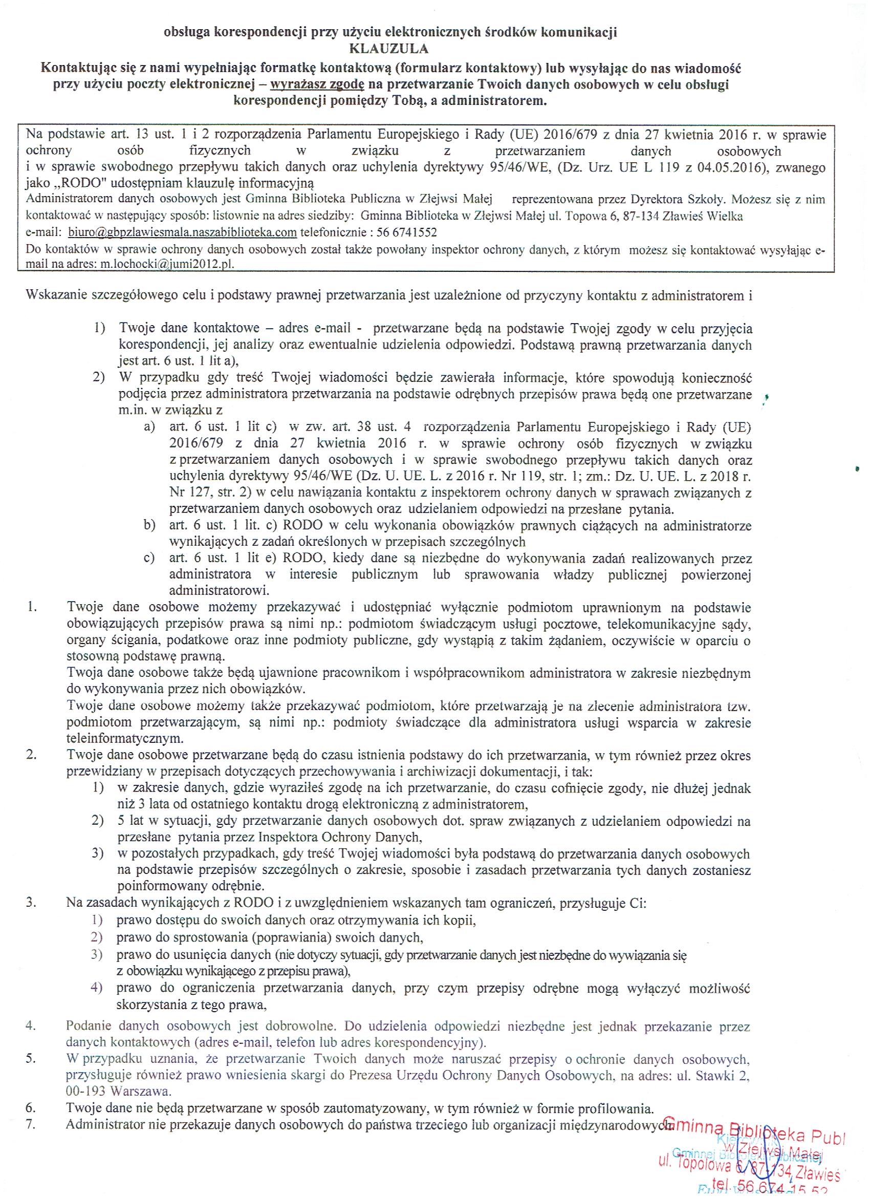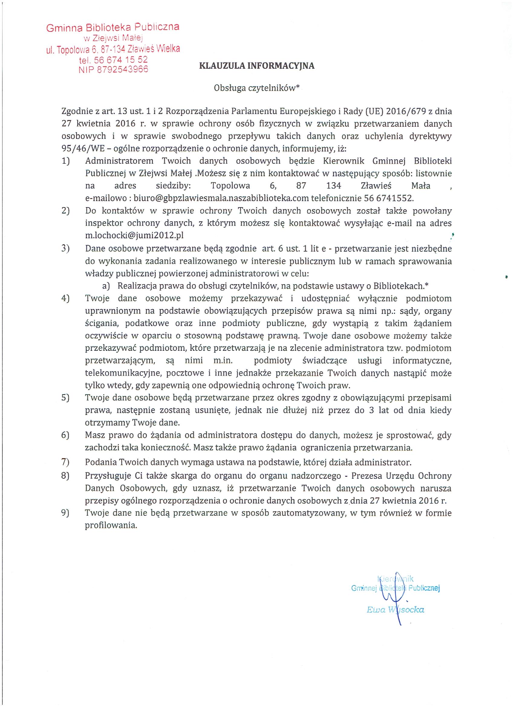 | Klauzula Informacyjna -Biblioteka str 1 | dodany: 09:05, 08.02.2021 | przez: Ewa Wysocka | |