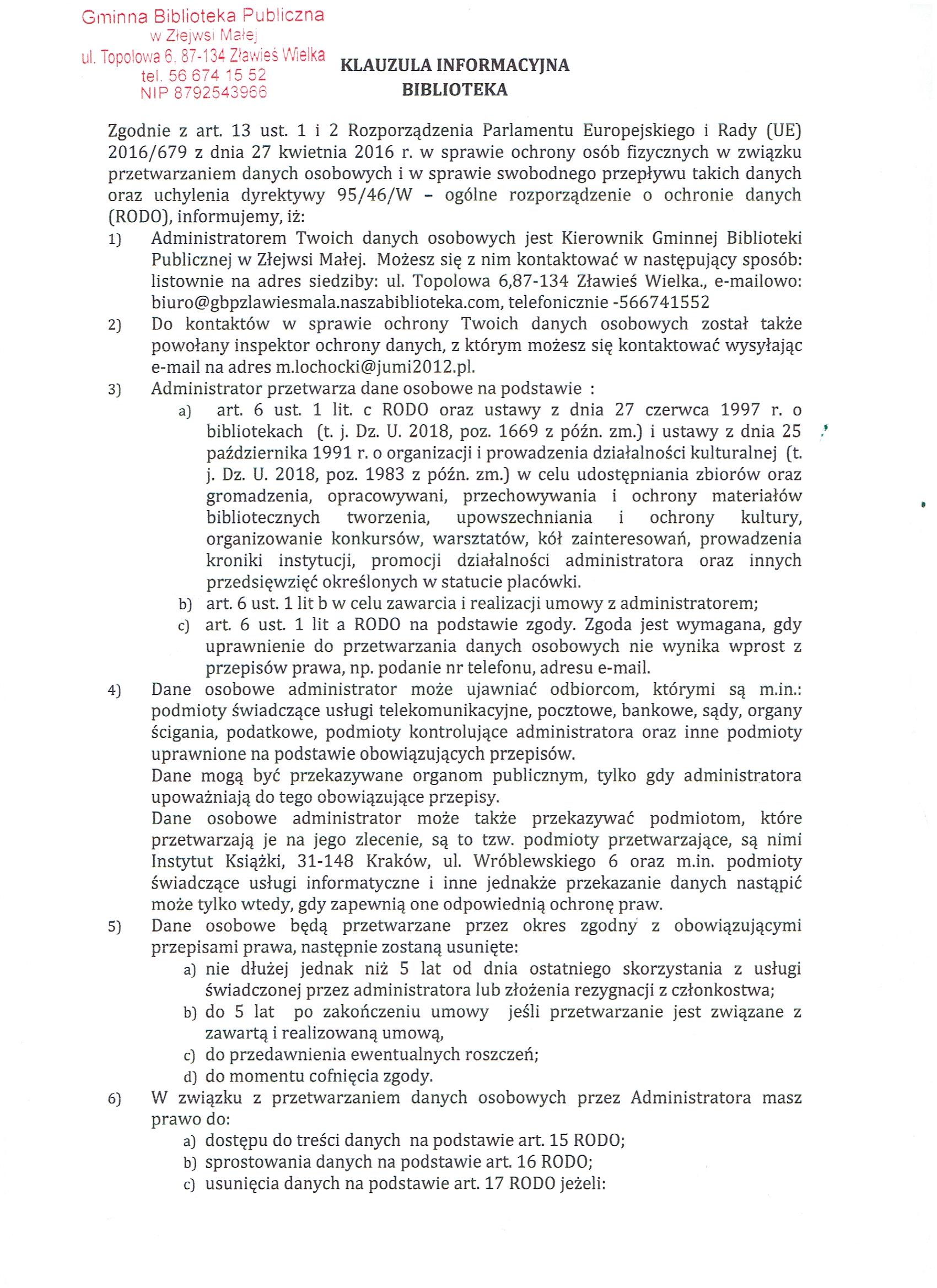 | Klauzula Informacyjna -Biblioteka str 1 | dodany: 09:05, 08.02.2021 | przez: Ewa Wysocka | |