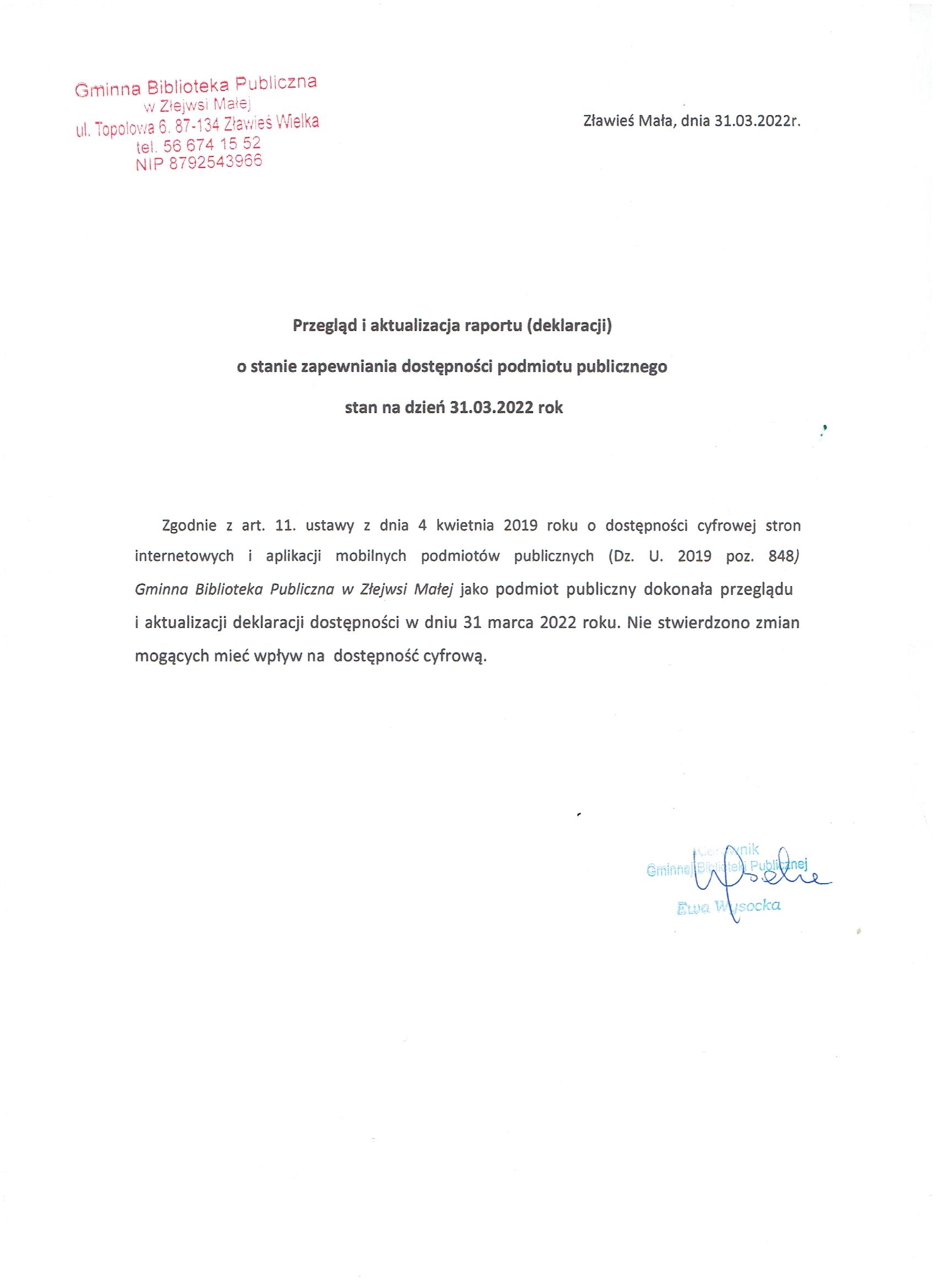 | Przegląd i aktualizacja raportu o sttanie zapewniania dostępności podmiotu publicznego na 31.03.2022r (Rozmiar: 147 kB, JPG) | dodany: 10:50, 01.04.2022 | przez: Ewa Wysocka |